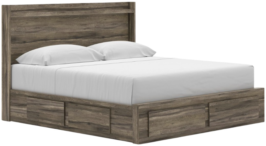 Rest in the casually cool style of this king panel storage bed. A weathered brown finish and chill LED lighting create an easygoing vibe, setting the scene in your restful retreat. Spacious drawers underneath provide plenty of storage. The bed's clean-lined design provides a fuss-free look.Read More