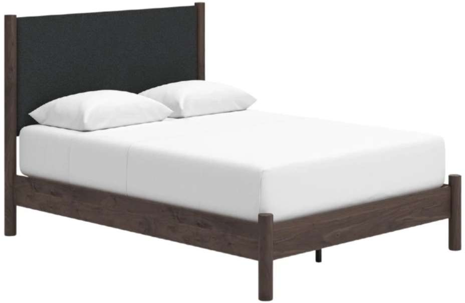 Includes upholstered panel headboard, platform footboard with rails and roll slats