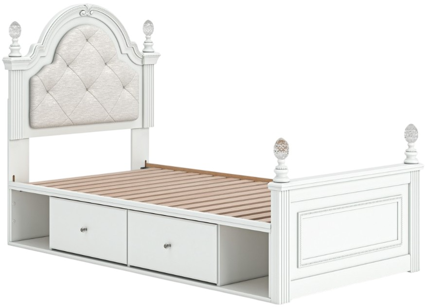 Fit for a princess. This twin upholstered panel storage bed’s crisp matte white finish pairs with charming ornate beading and sumptuous button-tufted upholstery—perfect for your girly girl. Decorative ball tops and multicolored LED lighting in the headboard are the crowning touches to make your little one feel like royalty.Read More